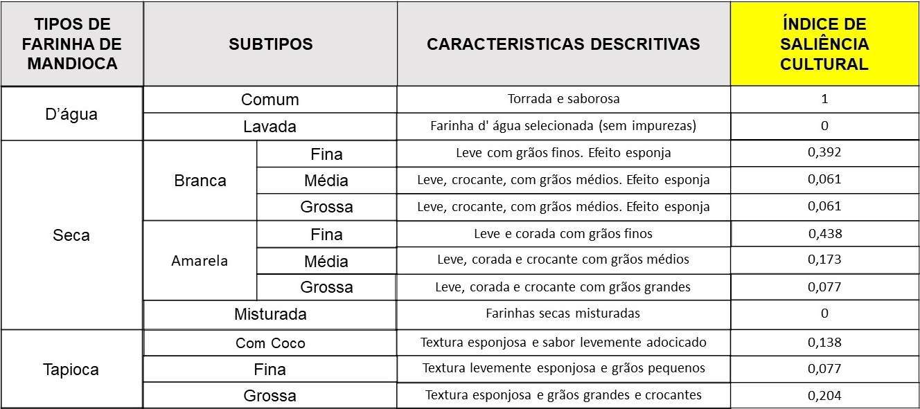显示更多 [+] 显示较少 [-]英语. Manioc flour (Manihot esculenta Crantz) is a food of historical reference and an invaluable cultural and economic product in the Amazon region. This study aimed to investigate the types of cassava flour marketed at the Ver-o-Peso fair (Belém, Pará), evaluating the associated socioeconomic and cultural aspects. The data collection included non-participant observation,semi-structured interviews, application of the free list and consultation of specialized works. At the Ver -o- Peso fair, three types of flour were identified (water, dry and tapioca), 12 subtypes of flour and three by-products (crueira, carimã and gum), with the. Flour of d’água var. the maximum value of importance.It is a flour that integrates the economic and cultural aspects, being the sellers' favorite because of its expressive market demand, and by consumers because it is traditionally mandatory accompaniment to meals. The typologies expressed individual values, the result of a laborious process of production, sale and consumption that transited between the economic and the cultural field.